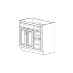 Vanity cabinet (36″W x 34.5″H x 21″D), drawers on the right